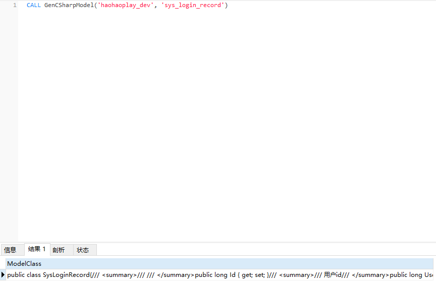 CALL GenCSharpModel('数据库名称', '表名称');