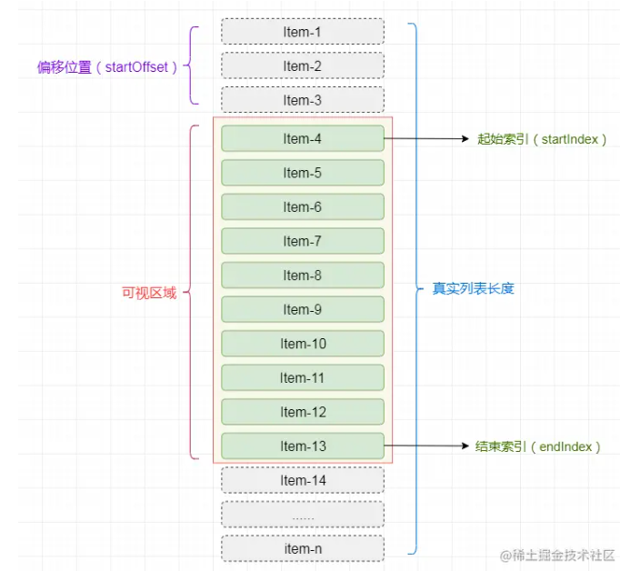 内需要的列表项,当滚动发生时,动态通过计算获得可视区域
