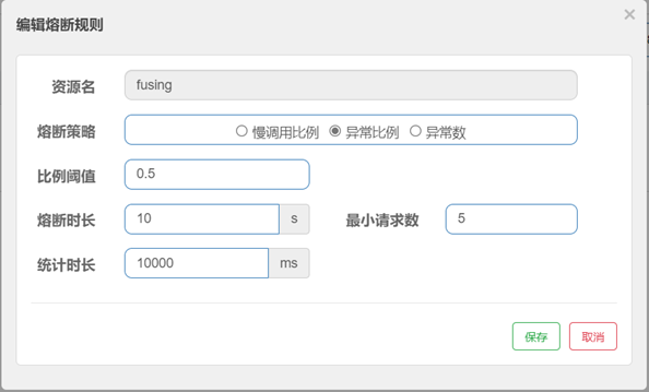 - 最小请求数:统计时长区间内,需要采集的最小请求样本数,如果统计时长区间内,所有请求都达到了最大RT,但是总的请求数没有达到设定的最小请求数,那么也不会触发熔断