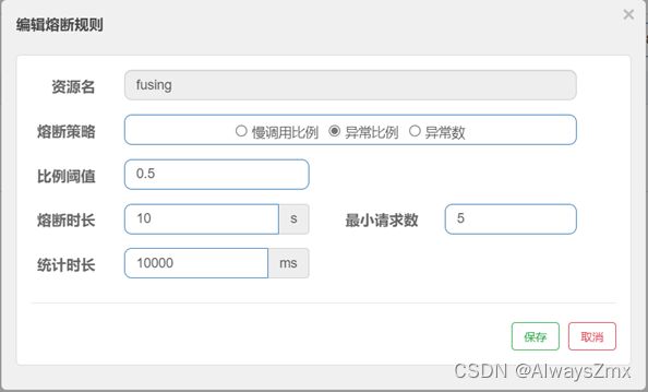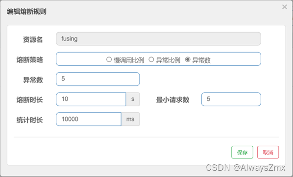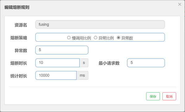 - 异常数:统计时长区间内,如果发生异常的请求数达到该阈值时,sentinel触发熔断机制