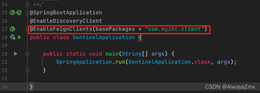 还需要在启动类上加上@EnableFeignClients注解,并指定FeignClient的包扫描路径: