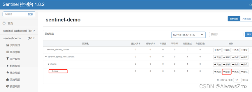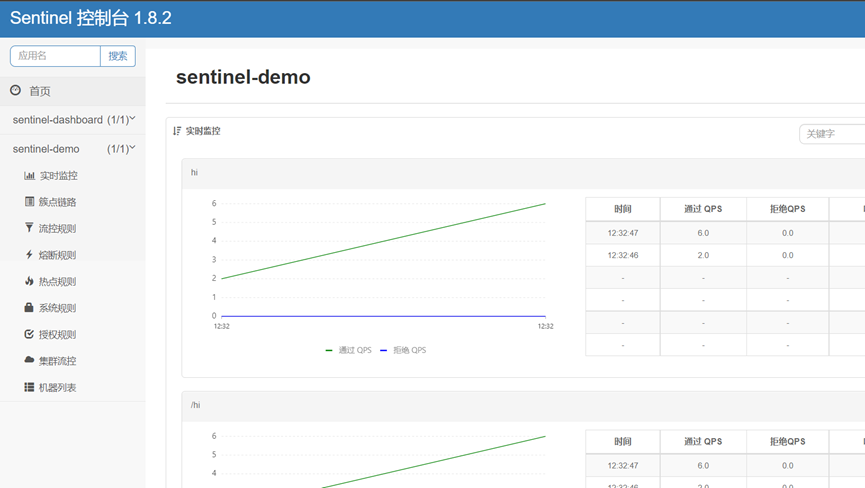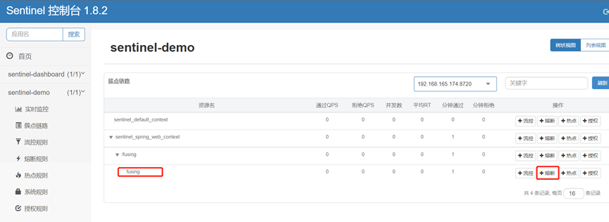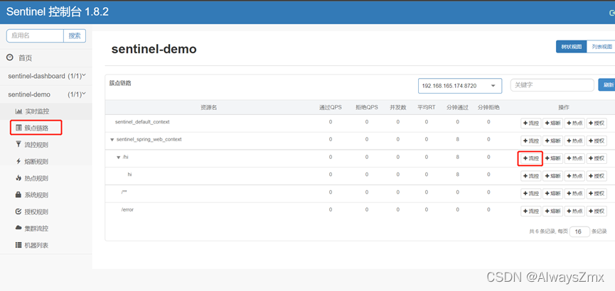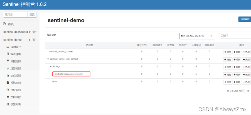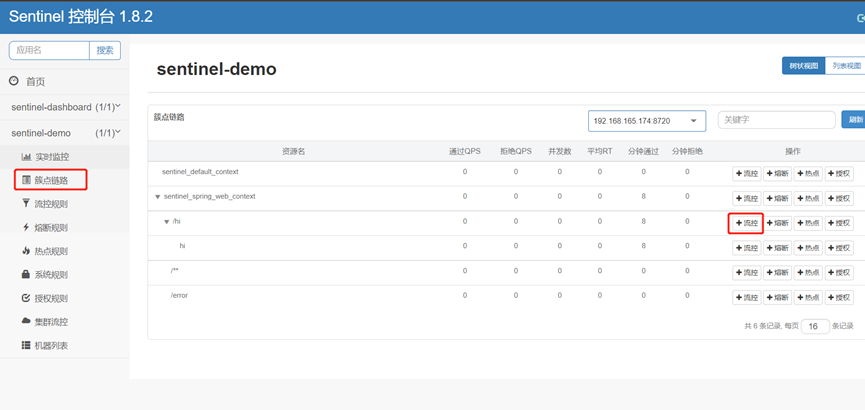 点击簇点链路,可以看到sentinel-demo服务的接口资源信息: