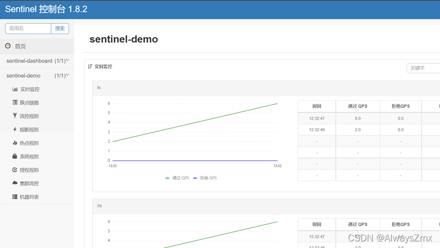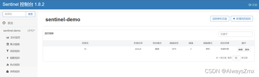 启动成功后,再一次访问sentinel,我们可以看到上一次测试时配置的资源名为/hi的流控规则: