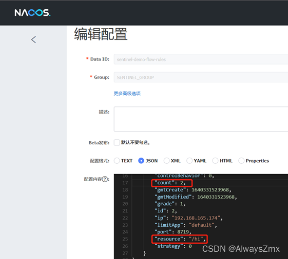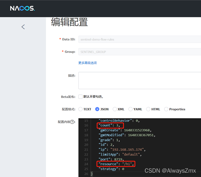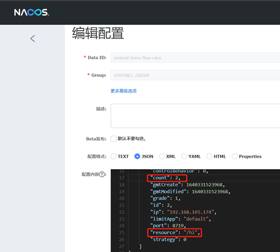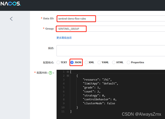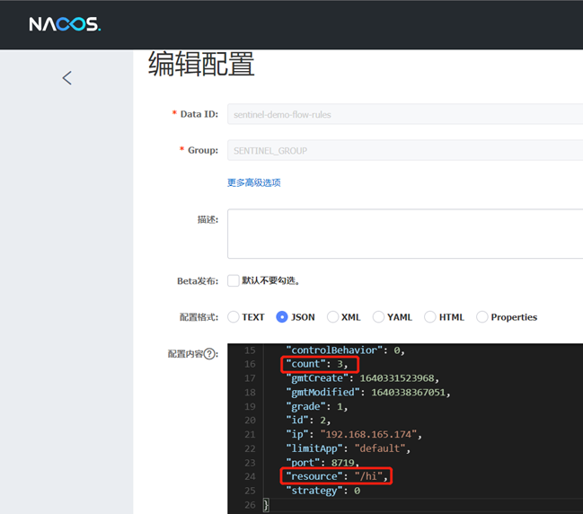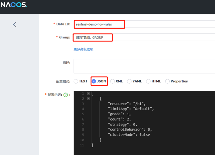 在Nacos控制台,对应的namespace,新建一个/hi接口的限流规则json配置文件,dataId为sentinel-demo-flow-rules,group为SENTINEL_GROUP,如下:
