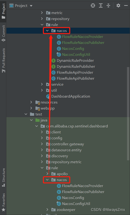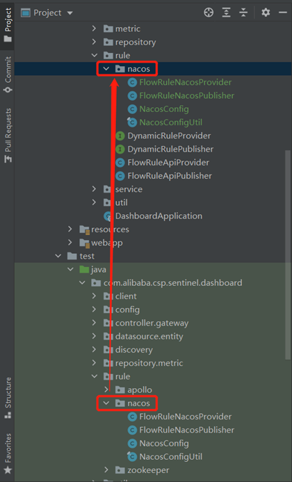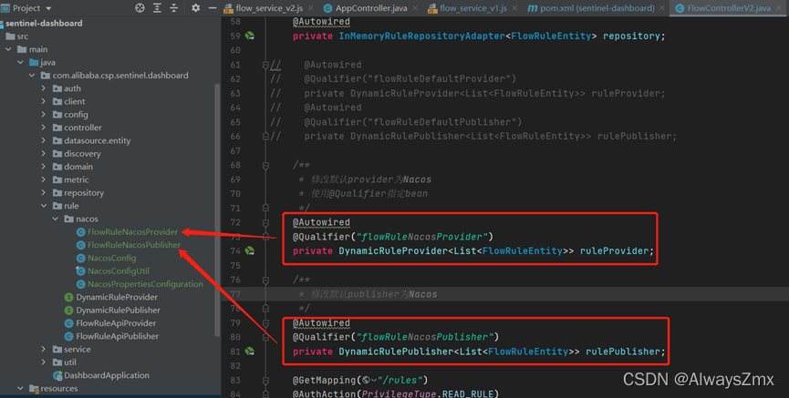 修改com.alibaba.csp.sentinel.dashboard.controller.v2.FlowControllerV2.java,注释掉之前默认注入的ruleProvider和rulePublisher两个bean,将从test目录拷贝过来的FlowRuleNacosProvider和FlowRuleNacosPublisher两个类注入进来,如下图,这两个类的作用分别为: