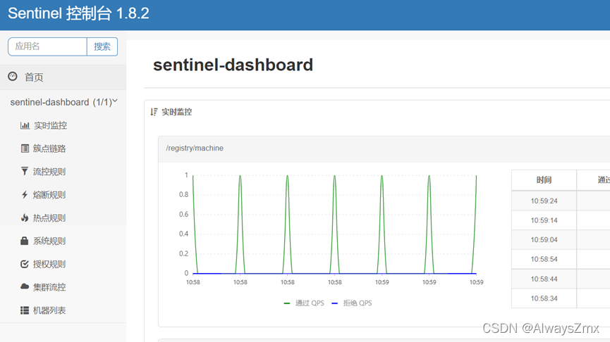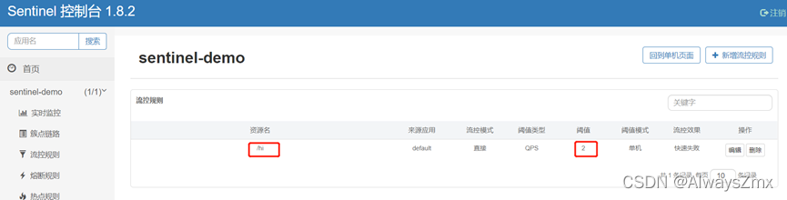 重启sentinel-demo服务,返回sentinel控制台发现之前配置的限流规则都不见了,这是因为sentinel默认将限流规则保存到了服务的内存中,因此当服务重启后,限流规则配置也就丢失了,后面会讲到如何将限流规则配置到nacos中,这样服务重启后规则配置就不会丢失了。重新配置限流规则阈值类型为QPS,单机阈值为2,在浏览器快速按F5刷新多次请求