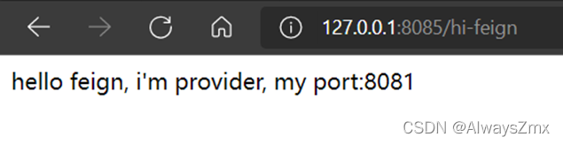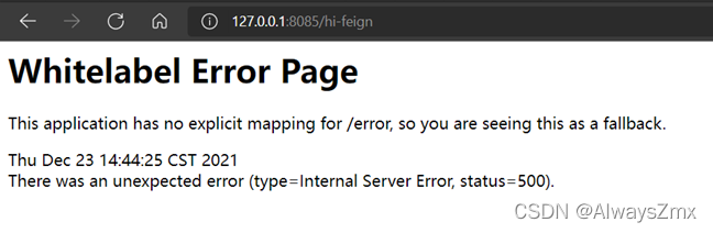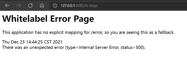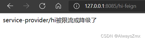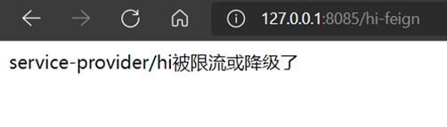 点击feign资源后面的流控按钮,添加流控,QPS设置为2,在浏览器上按F5快速刷新访问http://127.0.0.1:8085/hi-feign,浏览器在正常情况下是能够正常返回如下的信息,但是被限流时会返回错误页面: