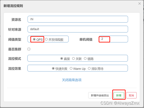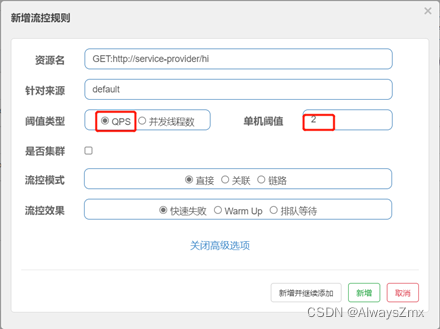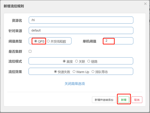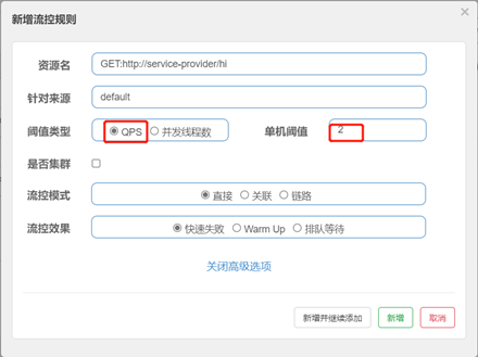 点击/hi接口对应的流控按钮,在弹出的设置界面选择阈值类型为QPS,单机阈值设置为2,点击新增:
