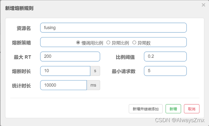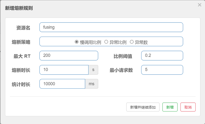 点击资源后面对应的熔断按钮,选择熔断策略为慢调用比例,这个熔断策略的逻辑是按接口的平均响应耗时统计来决定是否触发熔断。按下图所示配置好各个参数,点击新增。