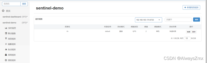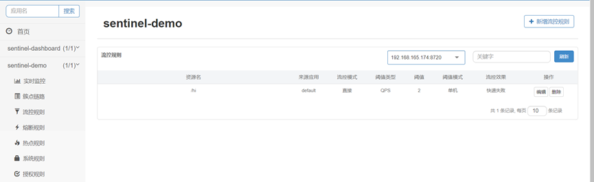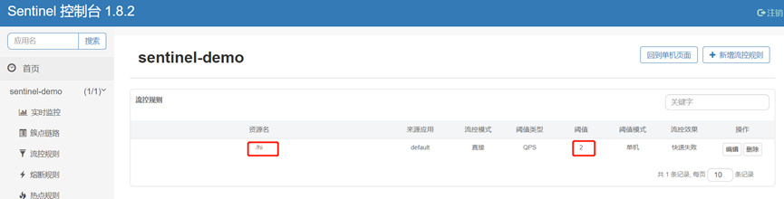 点击新增按钮后,会自动跳转到流控规则页面,这里展示了我们配置的流量控制规则: