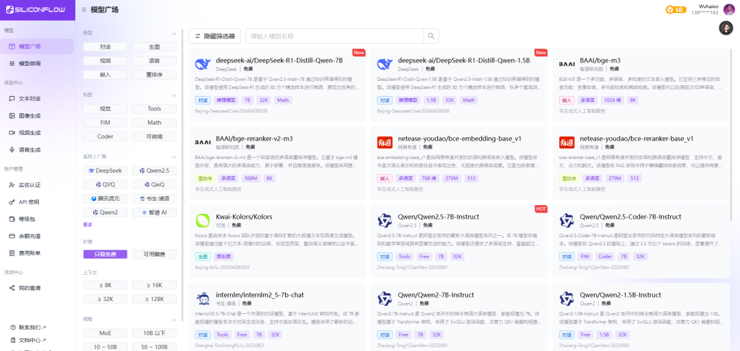 经过济宏哥广泛测试发现,硅基流动平台的AI模型接入数量众多,尤为重要的是,平台上还有免费模型可供使用!尽管deepseekr1:7b模型可以自行在笔记本上私有化搭建,但相比之下,免费使用公网模型岂不更为便捷?更何况,其他收费模型的费用也相当亲民。