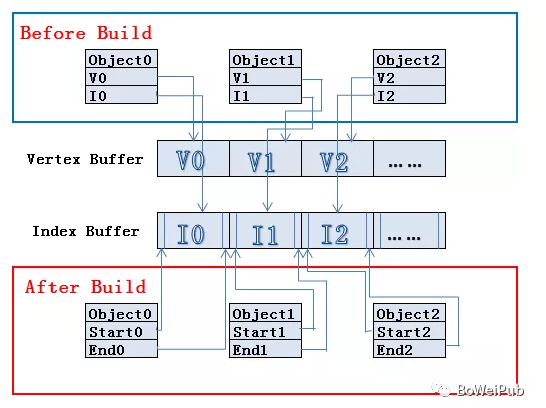 在build的时候,unity会将这些共享材质的静态模型的vertex buffer和index buffer,根据他们在场景的最终状态的信息,将模型的顶点转化为世界坐标下,储存在大的Vertex buffer和index buffer。并且记录子模型的index buffer数据在大的buffer的起始位置和结束位置。在后续的绘制中,一次性提交合并模型的数据,根据场景管理系统判断子模型的可见性然后设置一次渲染状态调用多次draw call分别绘制一次模型。