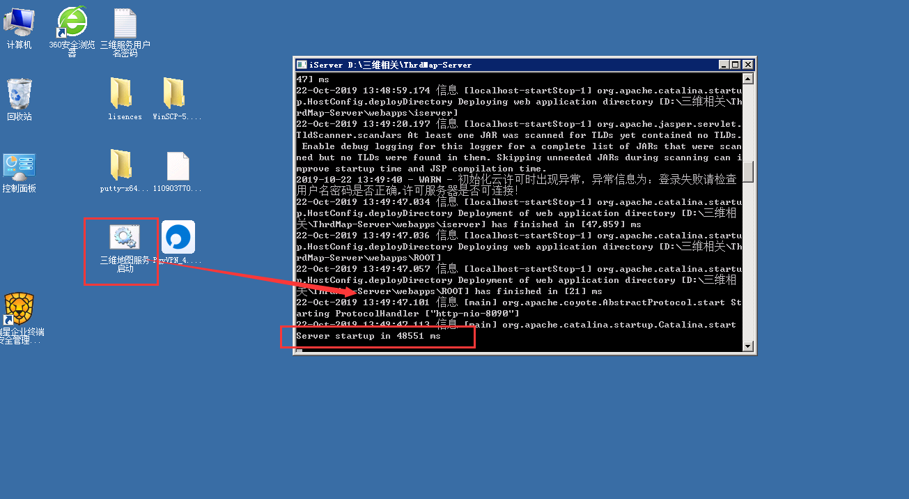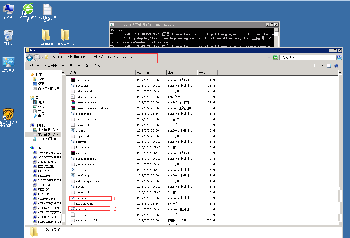 二,如果服务启动了,没有server startup in XXX ms字样,进入服务目录,D:\三维相关\ThrdMap-Server\bin,点击shutdown关闭服务,再点击startup重启服务。查看http://localhost:8090/iserver/services网页是否正常进入。