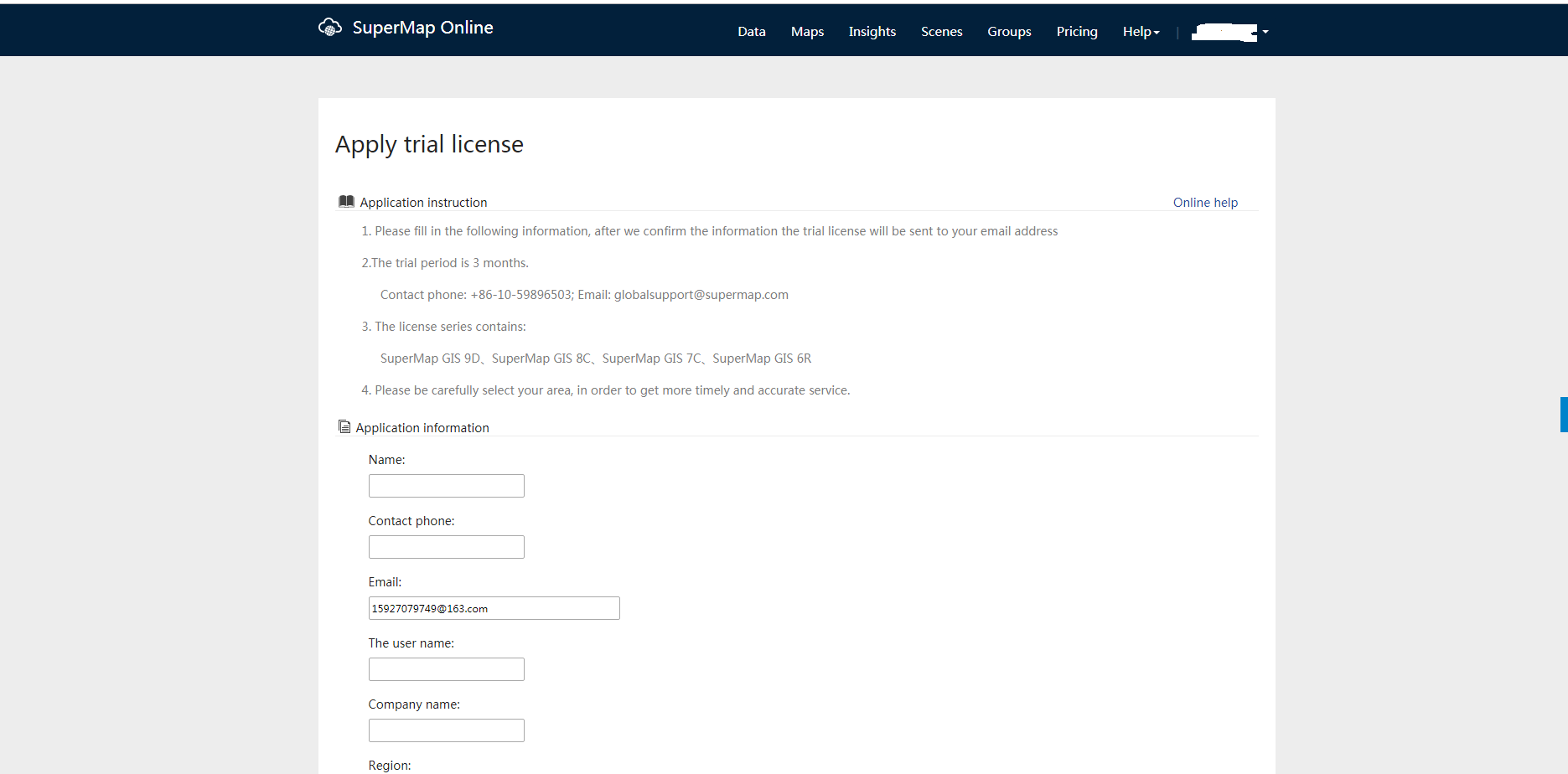 四、如果许可时间过期,我们需要重新在surpermap官网上申请许可(先注册),网址为:https://www.supermapol.com/web/pricing/triallicense,许可文件会直接发到你的个人邮箱