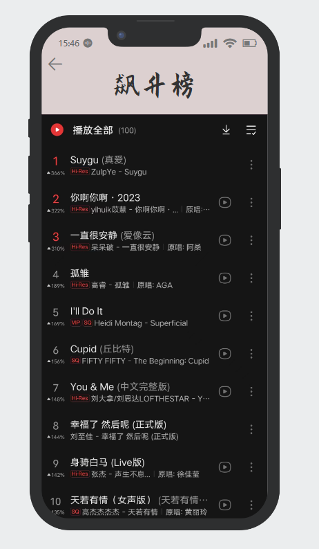 - 飙升榜页面显示当前时段播放量增幅最大的歌曲,使用户更加清晰当前热门音乐。