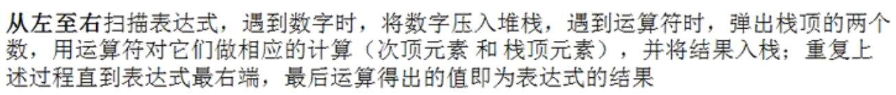 //从左往右扫描表达式,若是操作数直接入栈,遇到操作符则取出栈顶前两个元素进行运算,计算结果重新压入栈顶