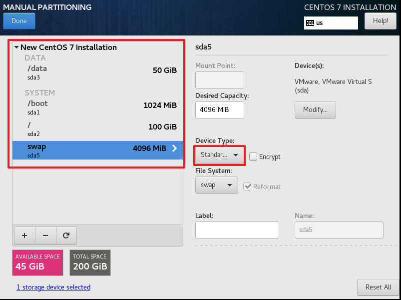 硬盘类型选Standard,200G分区大概按照下面的来分就可以了: