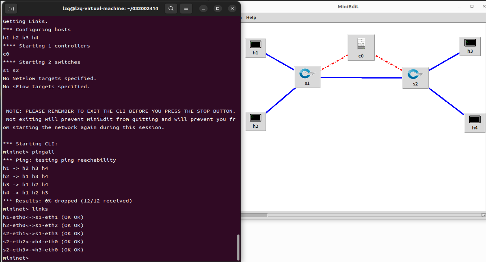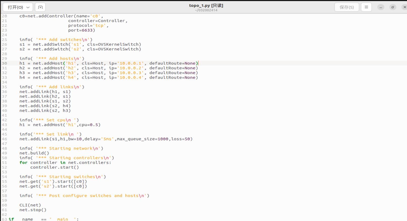 1.使用Mininet可视化工具,生成下图所示的拓扑,并保存拓扑文件名为学号.py。