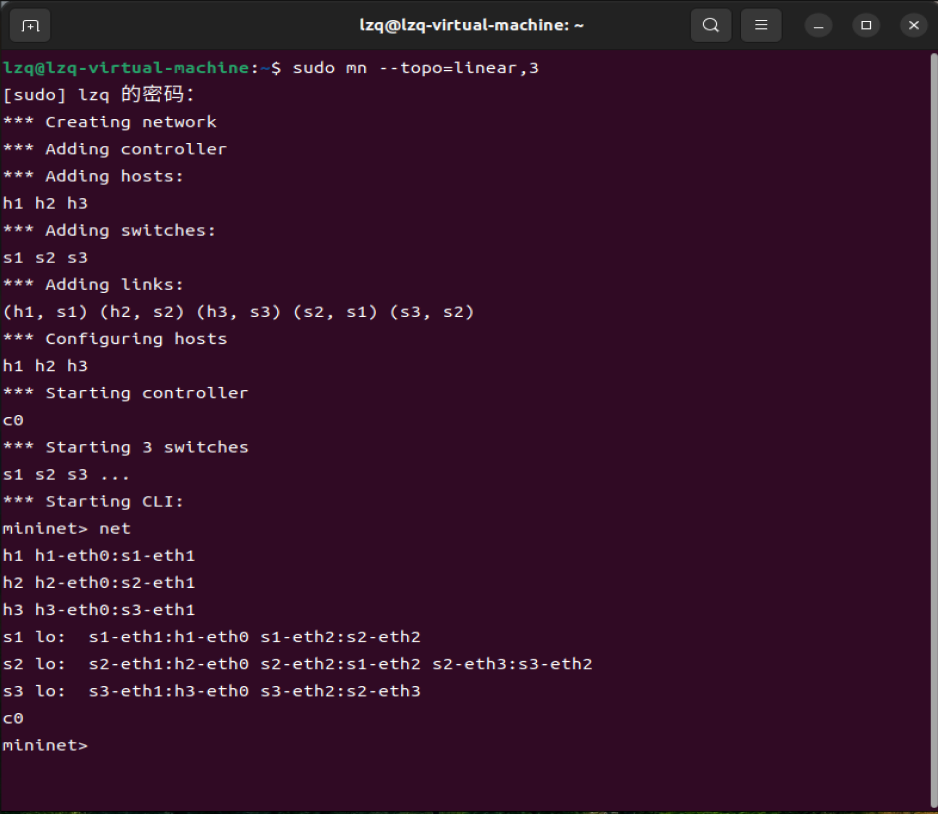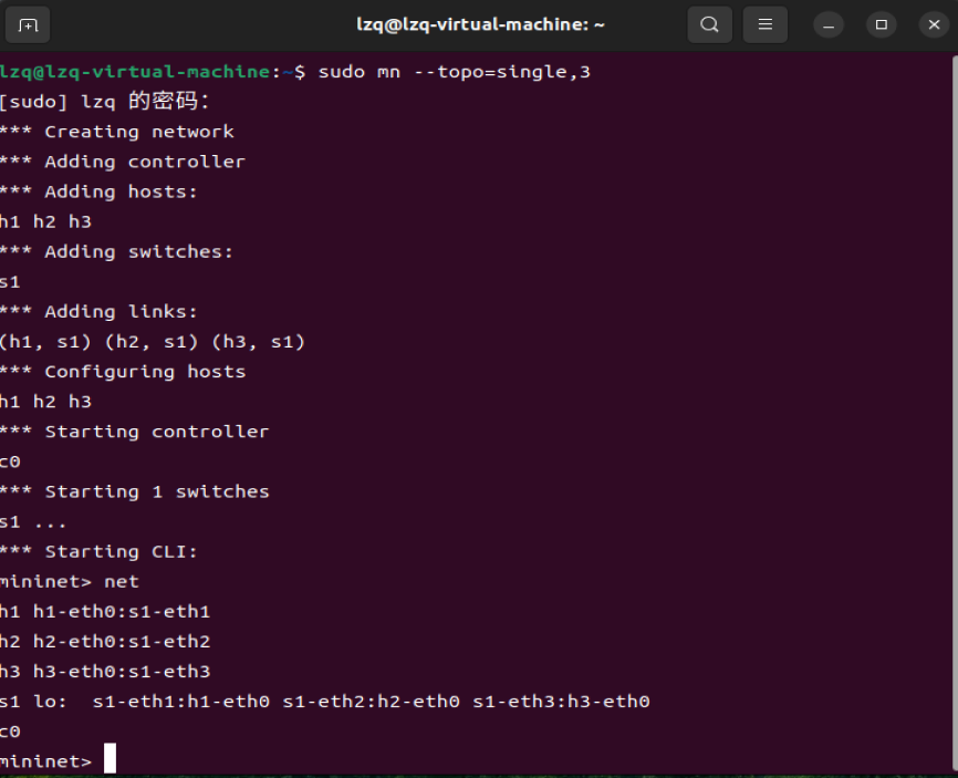 2.使用Mininet的命令行生成如下拓扑: