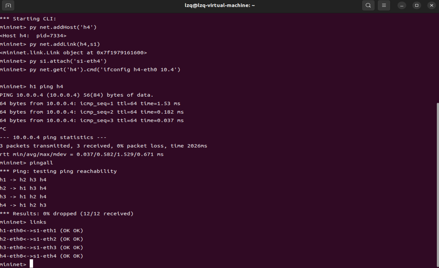3.在2 b)的基础上,在Mininet交互界面上新增1台主机并且连接到交换机上,再测试新拓扑的连通性。