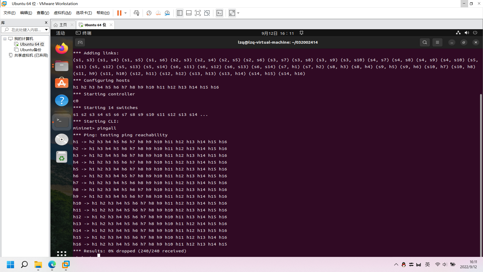 4.在编写python脚本生成拓扑后,使用sudo mn --custom 032002414_fattree.py --topo mytopo命令后续pingall无法ping通。查找资料得知是因为拓扑中存在环,可以使用switch ovsbr,stp=1参数ping通