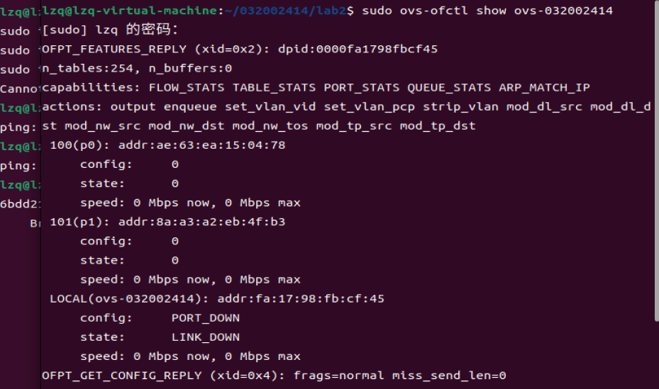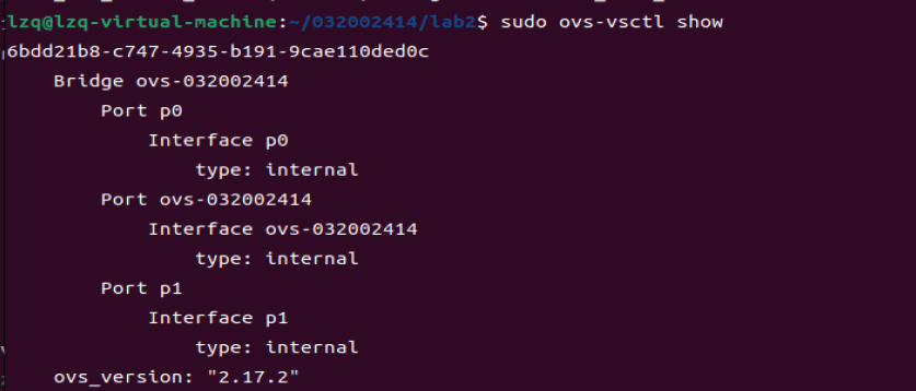 1. 在/home/用户名/学号/lab2/目录下执行ovs-vsctl show命令、以及p0和p1连通性测试的执行结果截图