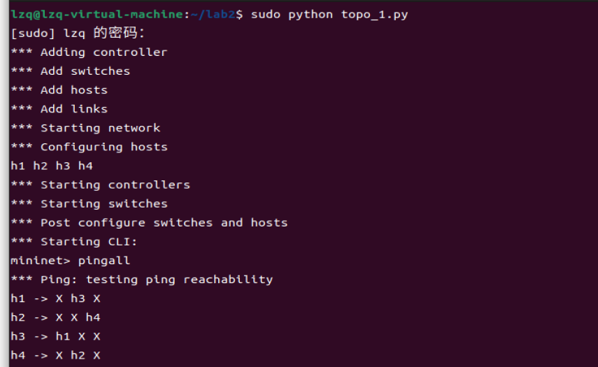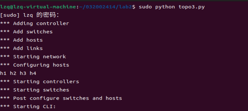 2. 在/home/用户名/学号/lab2/目录下开启Mininet CLI的截图
