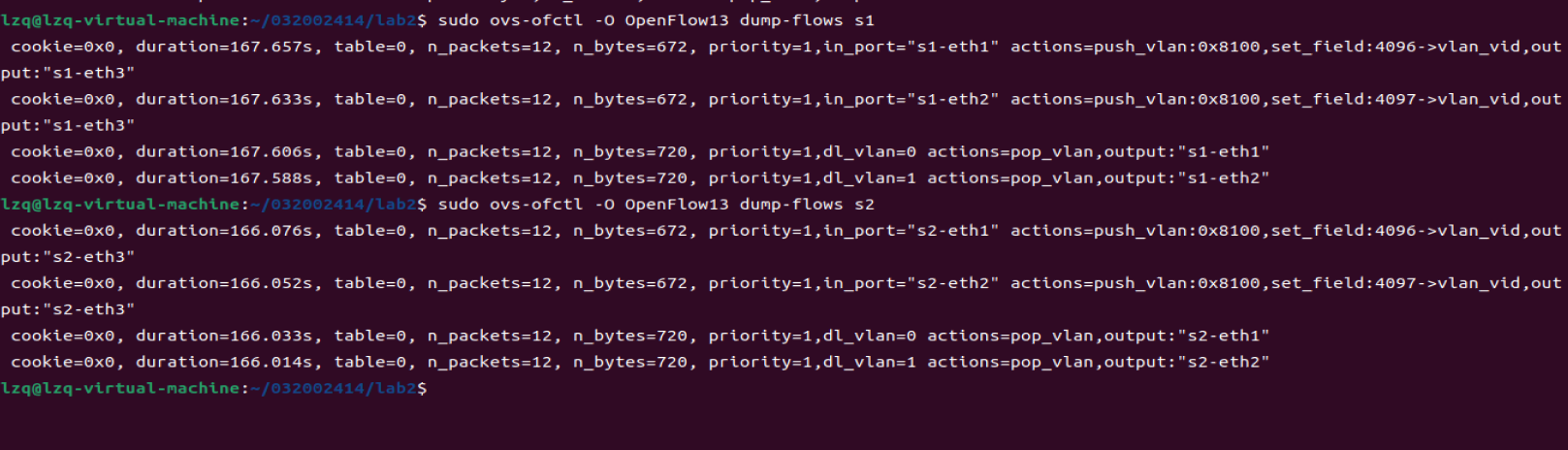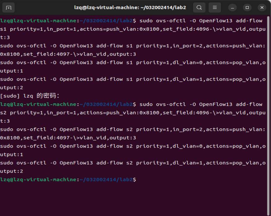 3. 通过命令行终端输入“ovs-ofctl”命令,直接在s1和s2上添加流表,划分出所要求的VLAN