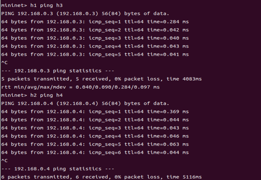 从图中可以看出:s1向s3发送的包中ID为0,而s2向s4发送的包中ID为1,符合预期