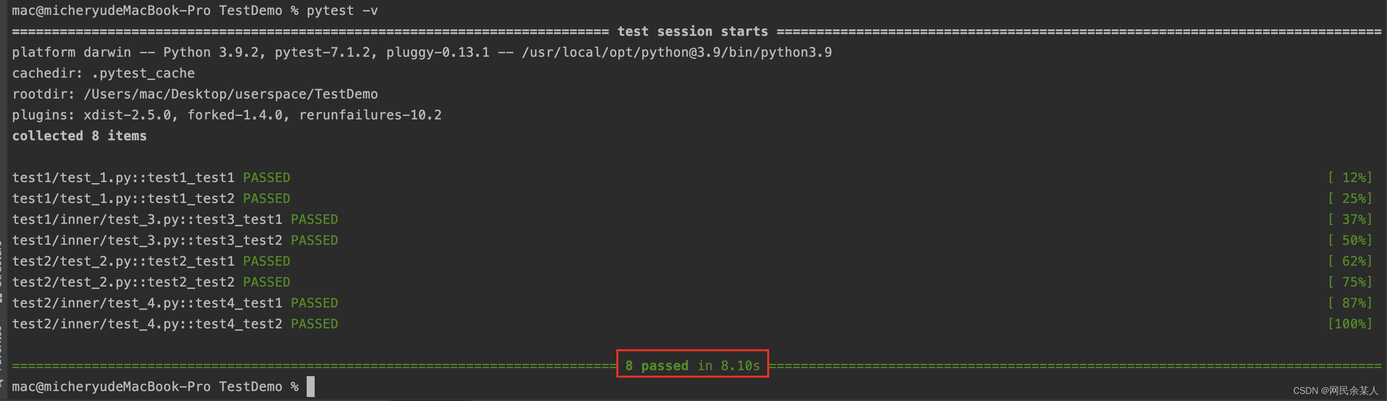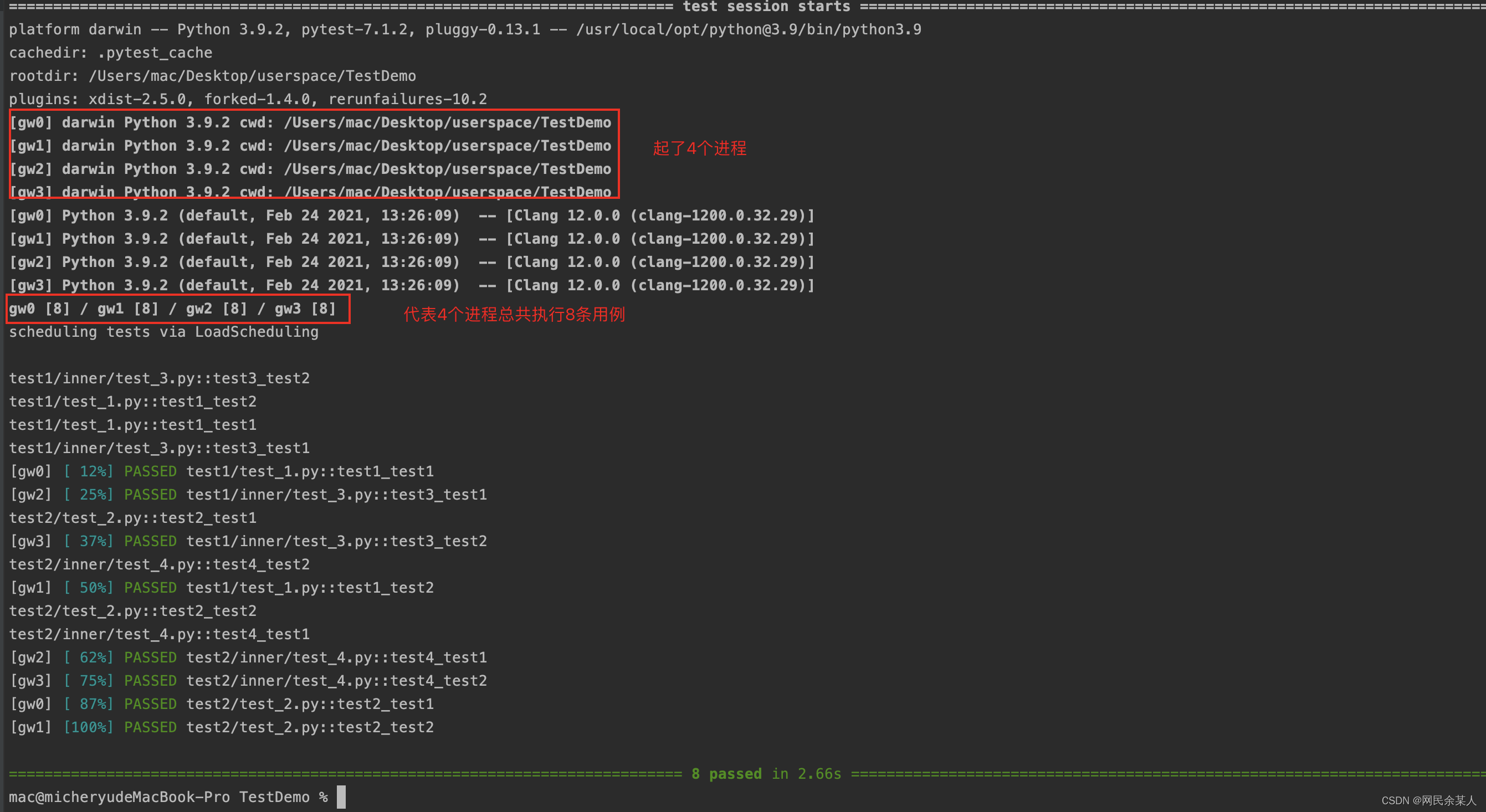 - pytest test.py --workers 2 --tests-per-worker 4 :2个进程并行,且每个进程最多4个线程运行,即总共最多8个线程运行。