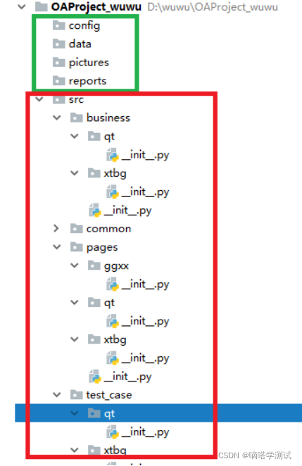 Config文件夹目录:用来存放配置信息相关的文件 例如:url.csv db.csvData文件夹目录: 用来存放测试数据文件的。例如:login_test_data.csvPictures文件夹目录:用来存放截图文件的。 例如:xxxx.pngReports文件夹目录:用来存放测试报告文件的。 例如: xxxx.htmlFiles文件夹目录:如果有上传附件功能实现自动化的话,就可以有。用来存放上传的那个附件文件。Src包:package:用来管理oa项目中所有的py文件Common包:存放通用,共同的代码的。 对应:第一层:基础,通用层