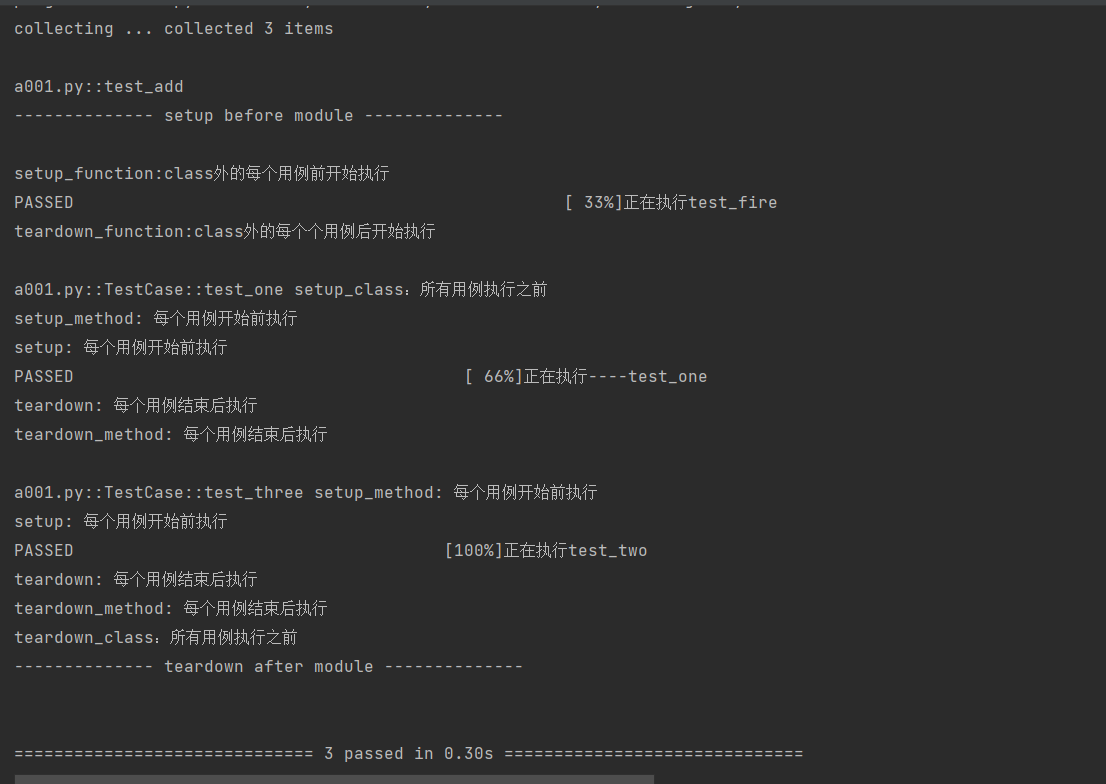 import pytest def setup_function(): print() print("setup_function:class外的每个用例前开始执行") def teardown_function(): print("teardown_function:class外的每个个用例后开始执行") def setup_module(): """ 一个module级别的setup,它会在本module(test_fixt_class.py)里 所有test执行之前,被调用一次。 注意,它是直接定义为一个module里的函数 """ print("-------------- setup before module --------------") def teardown_module(): """ 这是一个module级别的teardown,它会在本module(test_fixt_class.py)里 所有test执行完成之后,被调用一次。 注意,它是直接定义为一个module里的函数""" print("-------------- teardown after module --------------") def test_add(): print("正在执行test_fire") a = "hello" b = "hello word" assert a in b class TestCase(): def setup(self): print("setup: 每个用例开始前执行") def teardown(self): print("teardown: 每个用例结束后执行") def setup_class(self): print("setup_class:所有用例执行之前") def teardown_class(self): print("teardown_class:所有用例执行之前") def setup_method(self): print("setup_method: 每个用例开始前执行") def teardown_method(self): print("teardown_method: 每个用例结束后执行") def test_one(self): print("正在执行----test_one") x = "this" assert 'h' in x def test_three(self): print("正在执行test_two") a = "hello" b = "hello word" assert a in b def add(self,a, b): print("这是加减法") return a + b if __name__ == '__main__': pytest.main(['-s', 'test_fixt_class'])