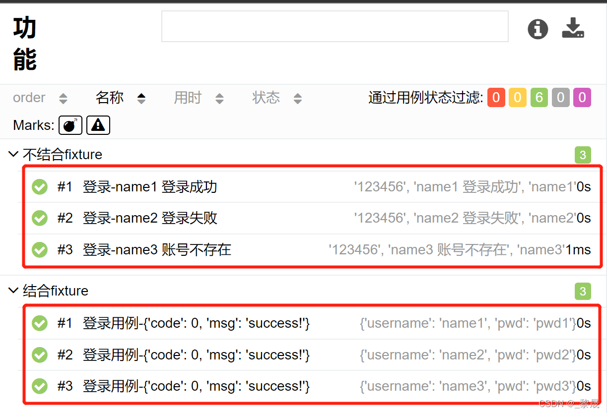 data_login_with_fixture = [ {"username": "name1", "pwd": "pwd1"}, {"username": "name2", "pwd": "pwd2"}, {"username": "name3", "pwd": "pwd3"} ] # 参数化+allure.title()动态生成标题,结合fixture @allure.title("登录用例-{login}") @pytest.mark.parametrize("login", data_login_with_fixture, indirect=True) def test_parametrize_without_id(login): assert login['code'] == 0 data_login_without_fixture = [ ("name1", "123456", "name1 登录成功"), ("name2", "123456", "name2 登录失败"), ("name3", "123456", "name3 账号不存在") ] # 参数化+allure.title()动态生成标题,不结合fixture @allure.title("登录-{title}") @pytest.mark.parametrize("username,pwd,title", data_login_without_fixture) def test_parametrize_without_id(username, pwd, title): pass