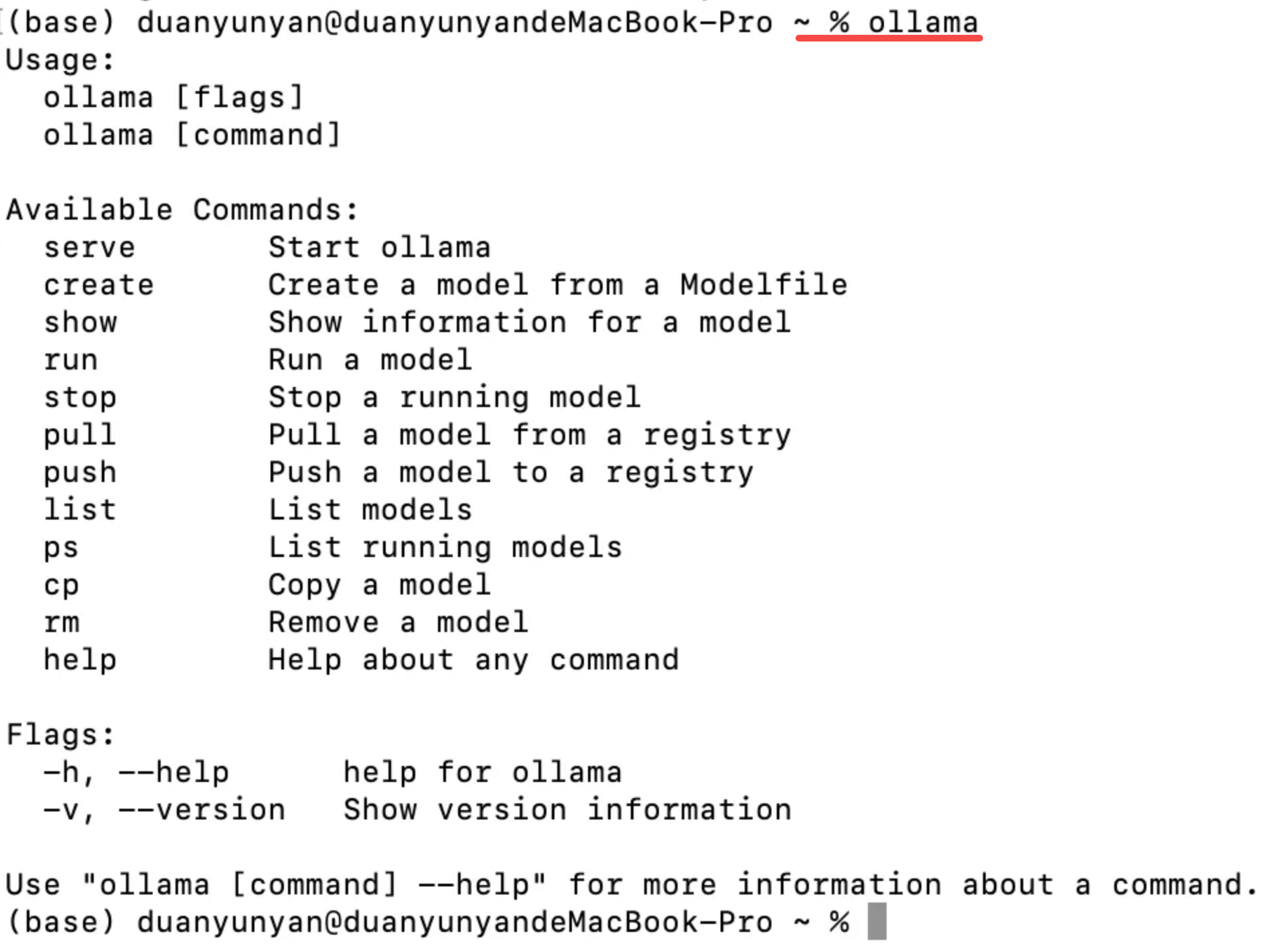 命令:ollama,出现下面内容,说明安装成功
