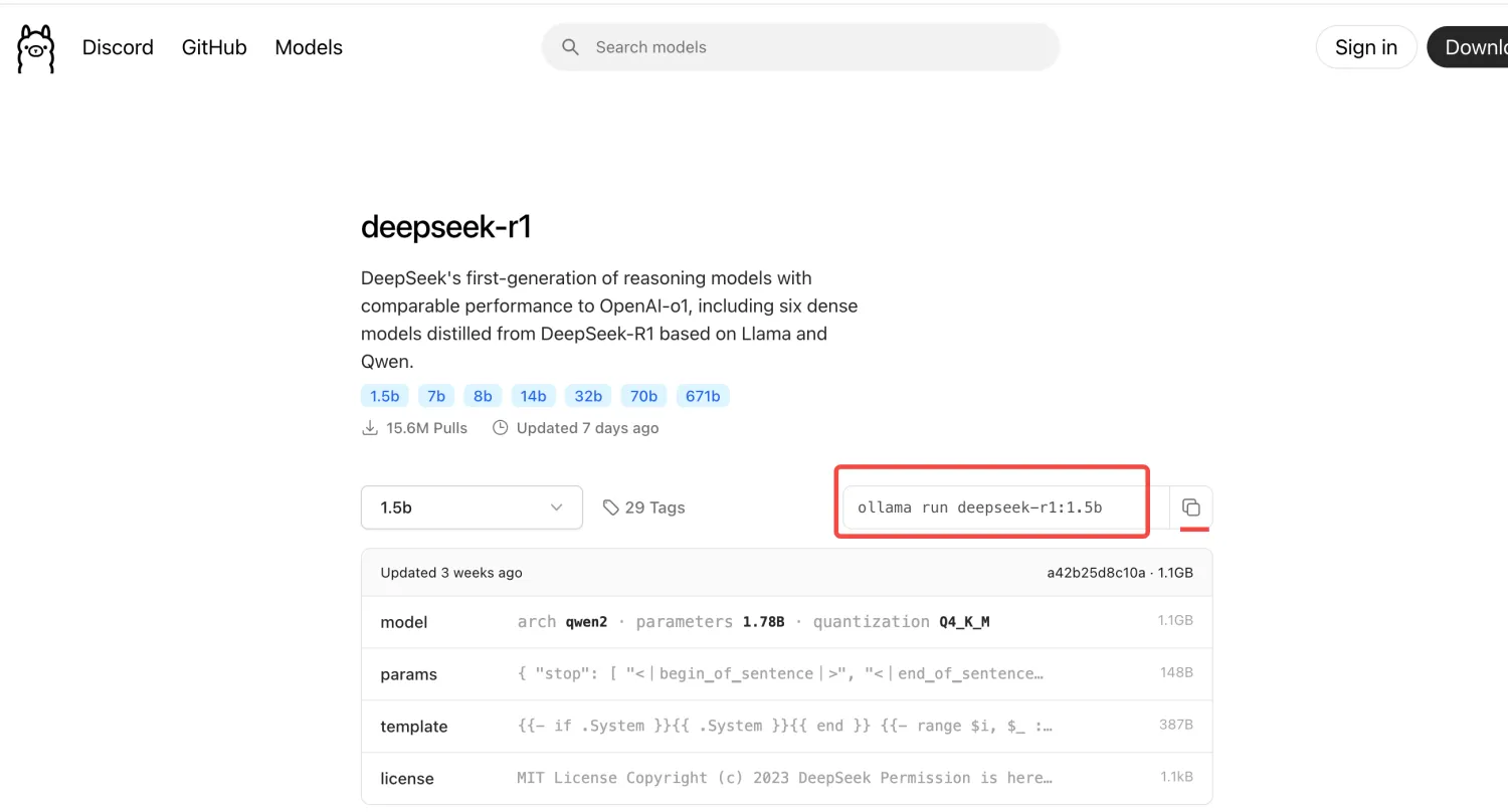 1.在https://ollama.com/library/deepseek-r1:1.5b 搜索deepseek-R1,跳转到下面的页面,复制这个命令,在终端执行,下载模型
