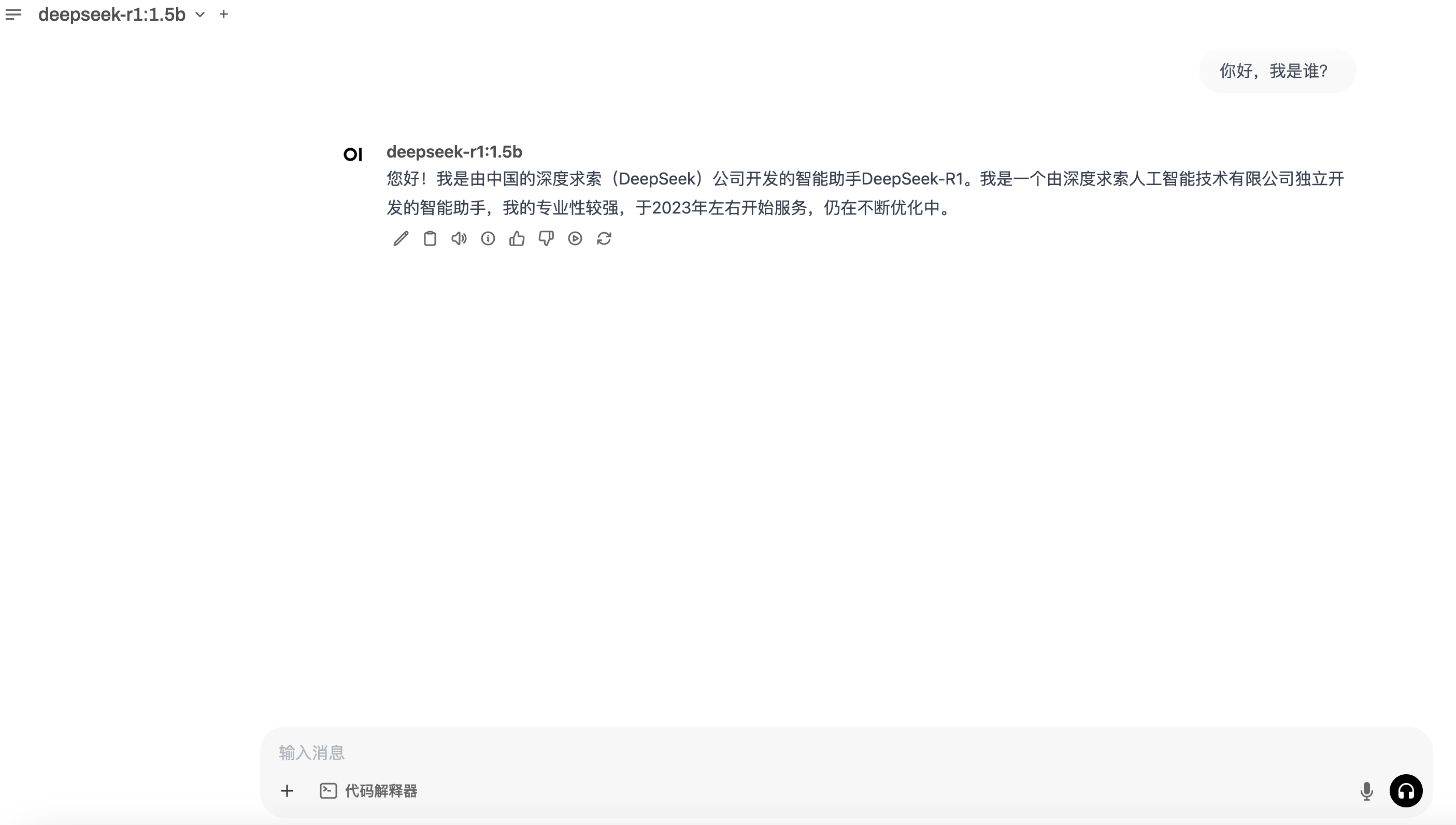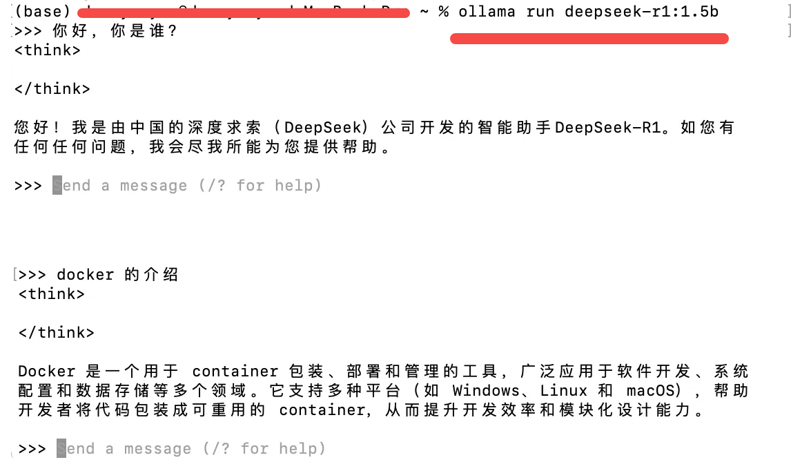 2.下载完成以后,会出现success,可以问:你好,你是谁?deepseek-R1,会给出回复。