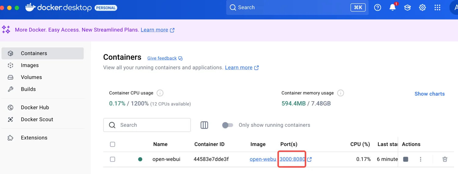 安装完以后,双击Docker图标,点击下面的端口,就可以运行Open WebUI,实现可视化问答,如下: