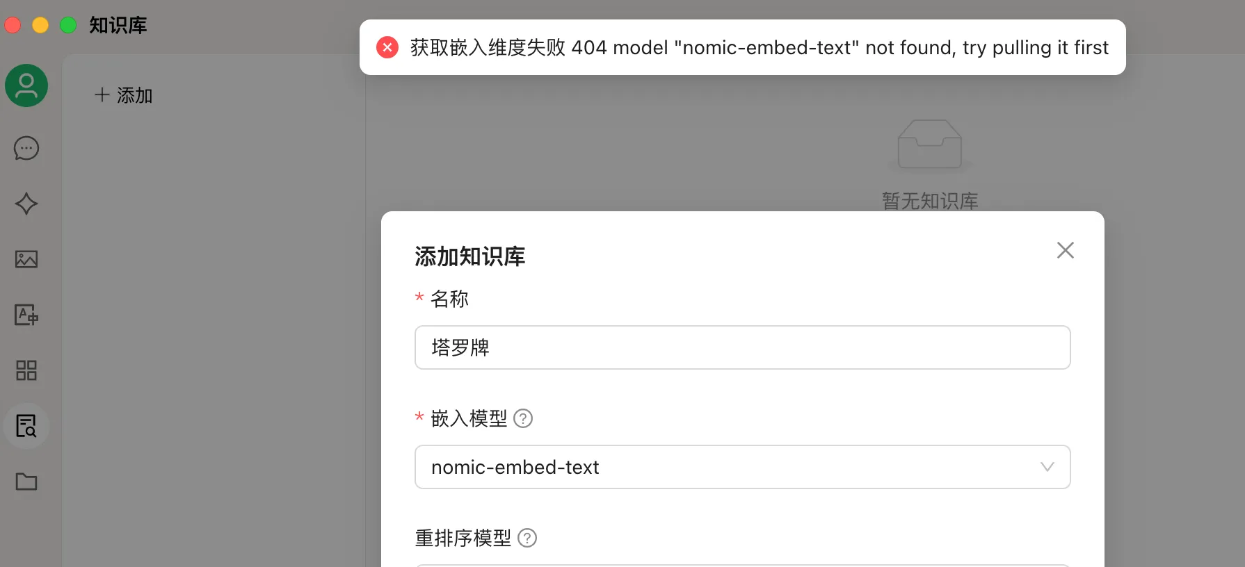 4)如果不先pull nomic-embed-text,直接添加使用,会遇到这个问题: