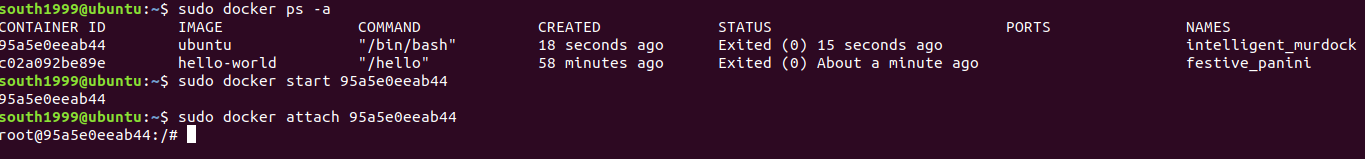 - 接下来查看一下当前的容器,发现容器有两个,一个是我们测试安装docker时创建的,另外一个是我们刚才使用ubuntu镜像创建的