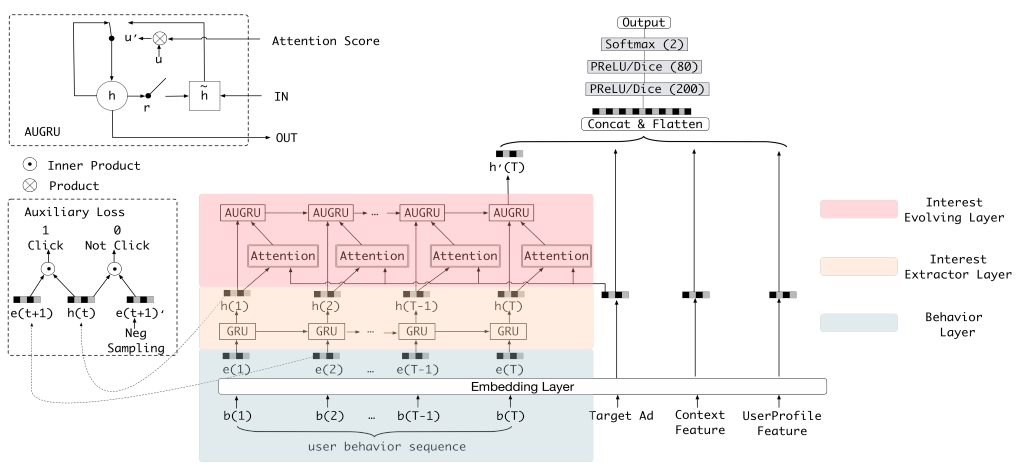 用户的兴趣是不断变化的,因此捕获兴趣的动态性对于表示兴趣来说十分重要。这里就只介绍关键的两部分,兴趣提取层和兴趣演变层。其余部分和DIN模型相似。