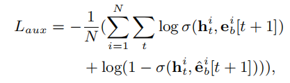 由于对物品点击行为的预测取决于最终的兴趣状态,标签中只包含监督最终兴趣的真值GRU中一些列隐藏状态无法得到很好的监督,因此引入一个辅助损失,我们使用t+1时刻的行为监督t时刻的隐藏状态,同时再采样一个不在交互序列中的物品当作负样本。然后有以下损失函数
