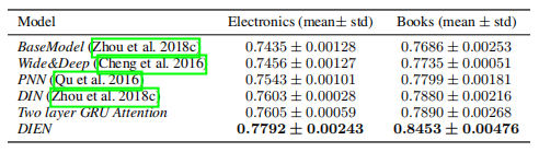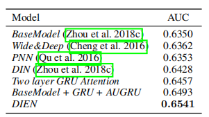 DIEN在公共数据集上和工业数据集上均取得最好的效果。