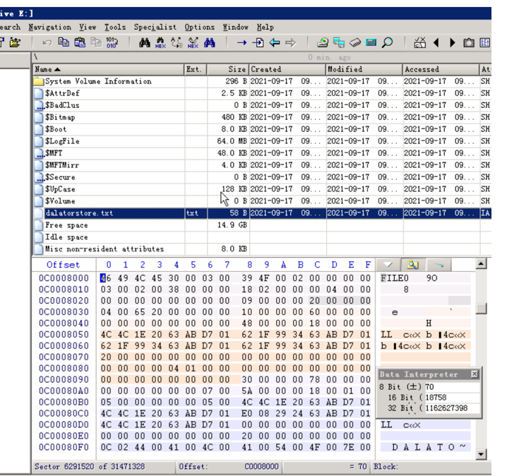 可以看到winhex自动查找硬盘文件系统,查找后找到被删除文件,被删除文件与存在的文件颜色不同: