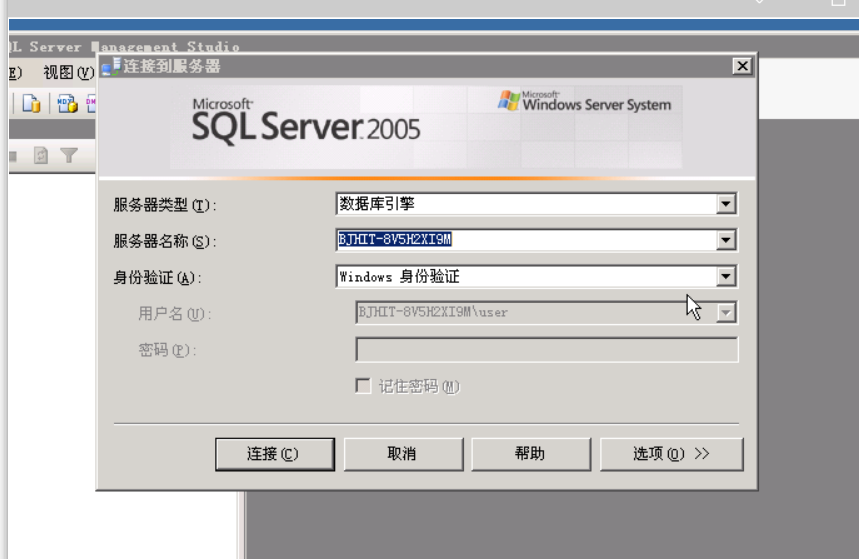 ①在桌面上单击“开始”,选择“程序”→“Microsoft SQL Server 2005” →“SQL Server Management Studio”,出现“连接到服务器”对话框。