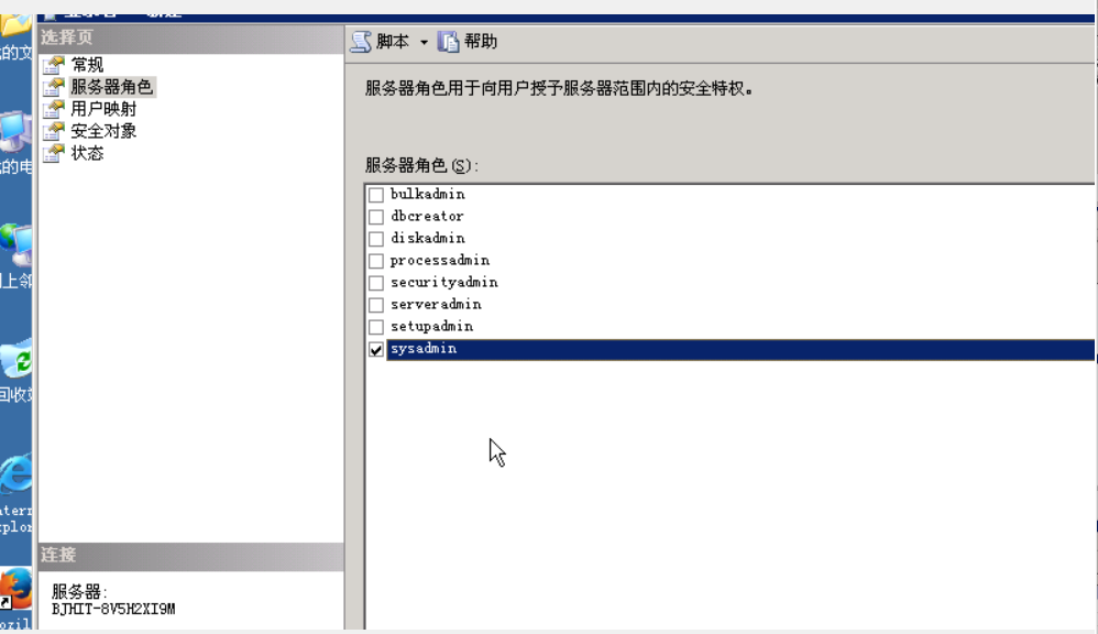 ③选择“服务器角色”选项卡。可以在服务器角色列表框中选择相应的服务器角色成员。在这里,设置登录用户winuser的服务器角色为系统管理员。