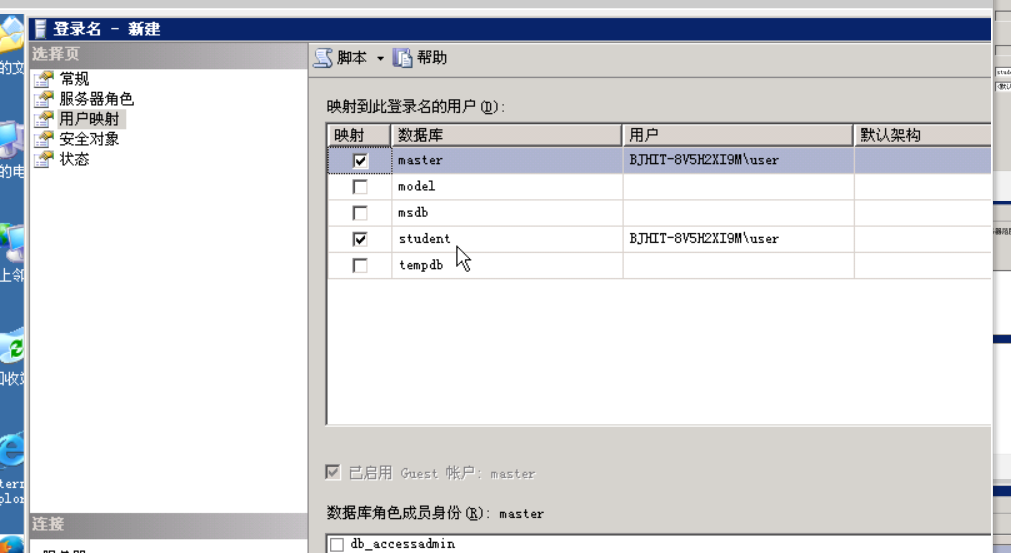 ④选择“用户映射”选项卡,在列表框中列出了该账号可以访问的数据库,如果单击数据库左边的复选框,表示该用户可以访问相应的数据库。在这里,选中数据库master和student左边的复选框,表示登陆用户winuser可以访问的数据库为master和student。在下方的数据库角色成员身份都选择public。然后点击确定。