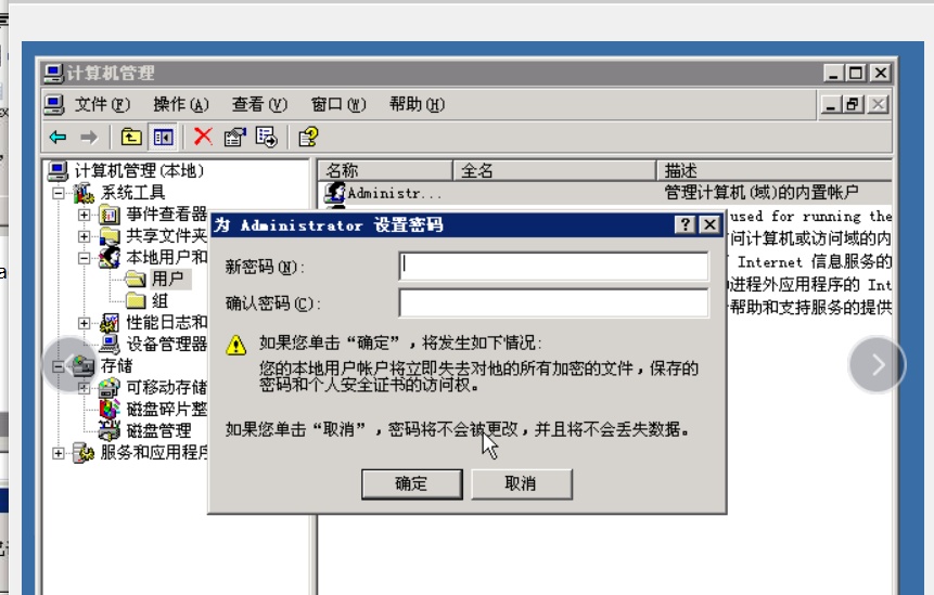 来到桌面,右击我的电脑,点击管理,在计算机管理窗口,依次展开 系统工具-本地用户和组-用户(不会的可参考之前新建winuser时的步骤),在右侧右击administrator,选择设置密码。