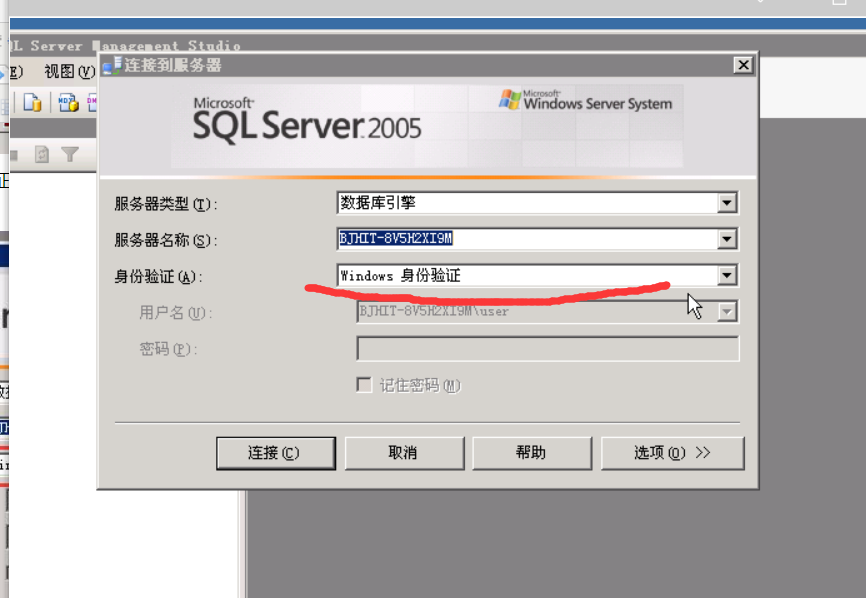 ④关闭SQL Server Management Studio重新打开,在登录页面处身份验证选择SQL Server身份验证。然后输入刚才新建的账号和密码,然后点击连接。