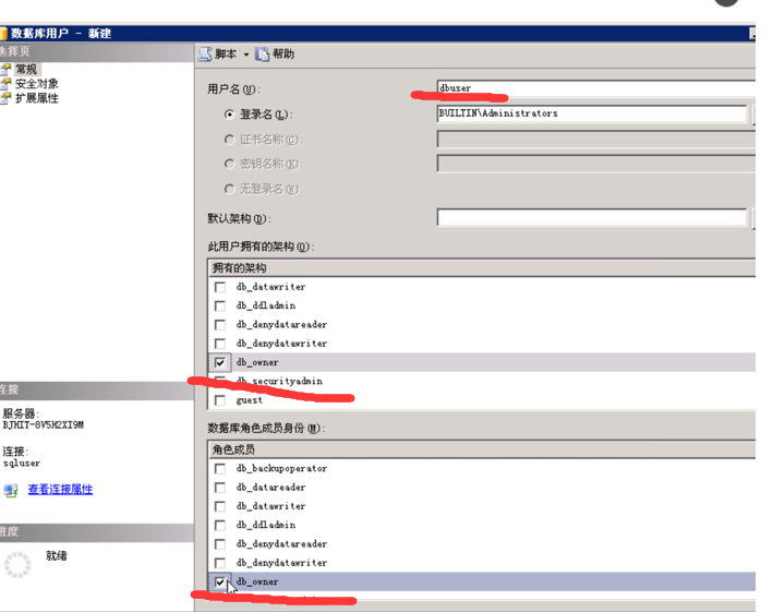 点击确定,在此用户拥有的架构勾选db_owner,数据库角色成员身份同样选择db_owner,单击“确定”按钮,即可完成数据库用户的创建。