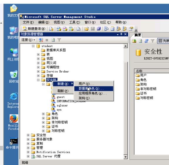 打开SQL Server Management Studio,展开服务器-数据库,选择要创建用户的数据库,如student,展开student,用鼠标右键单击“安全性”节点,从弹出的菜单中选择“新建-数据库角色”命令。